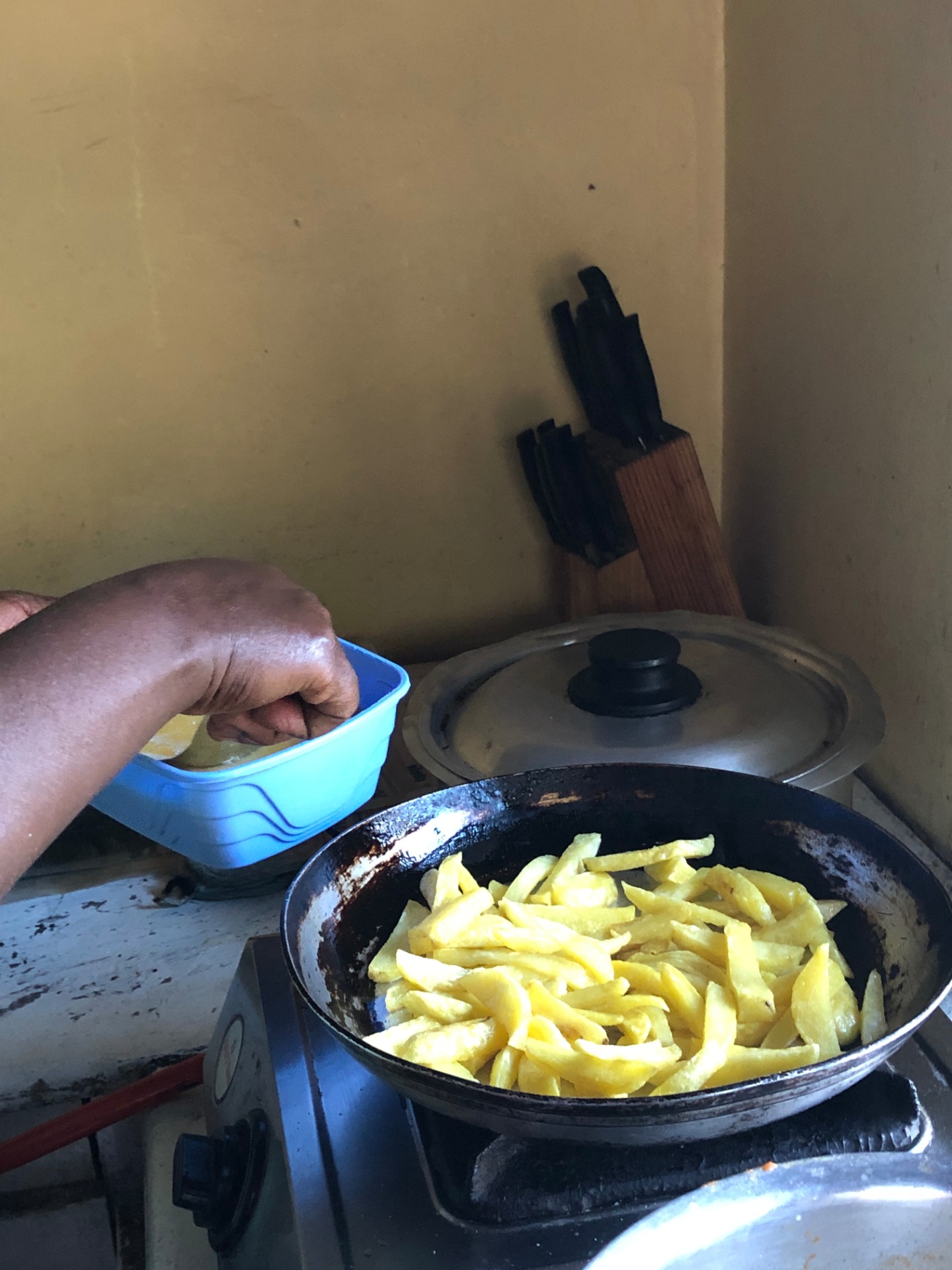 Op woensdag leerde Aloisia ons chipsi mayai maken. Eerst moesten we aardappelen schillen en in frietjes snijden. Daarna kon het wachten beginnen. De olie op het vuurtje moest eerst heet genoeg zijn voordat we de frietjes konden bakken. Dit duurden heel erg lang. Uiteindelijk waren de frietjes gebakken en konden we de chipsi maken. Eerst een beetje olie in de pan, frietjes erbij en er het eiermengsel overgieten. Na de chipsi te draaien was hij klaar en konden we ervan smullen. Mmm, wat smaakte dat! (2.4. culturele ontvankelijkheid)