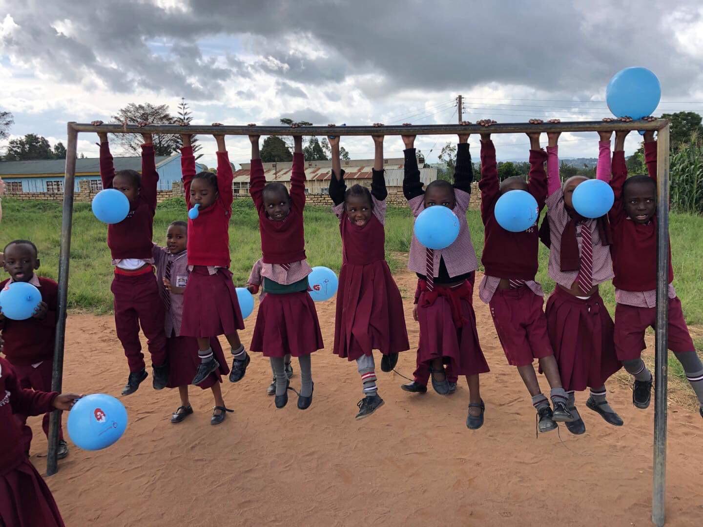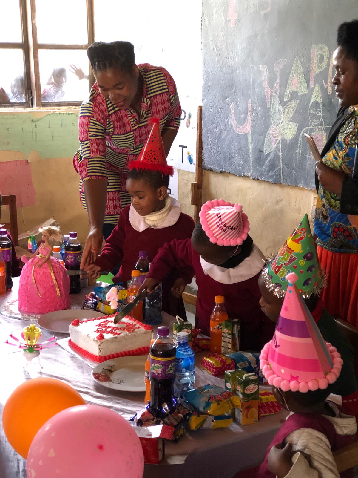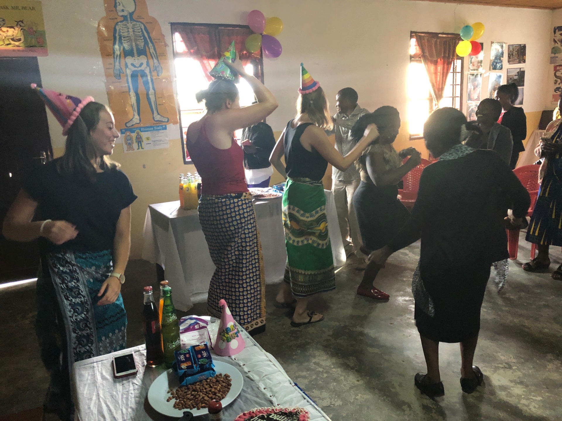 We werden ook onverwachts ook uitgenodigd op een verjaardagsfeest bij de kleintjes. Er waren twee jarigen en we mochten mee gaan vieren. Alle leerlingen zaten aan de lange tafels, ze hadden allemaal koekjes en drankjes gekregen. Enkele kinderen moesten tijdens het zingen vooraan in de klas gaan staan en dansen. Iedereen zong dan "Happy happy birthday, it's your special day. Shake shake and celebrate, shake shake and celebrate". De kinderen vooraan moisten dan met hun poep schudden en dansen. Heel leuk om te zien. Dan was het tijd voor de taart. De jarigen mochten eerst kaarsjes uitblazen en daarna zelf de taart snijden. Nadat de taart in stukjes was mochten ze alle volwassenen een stukje taart in hun mond steken. Dit was ook leuk om mee te mogen maken. We gaven deze kindjes elk enkele ballonnen als cadeau.