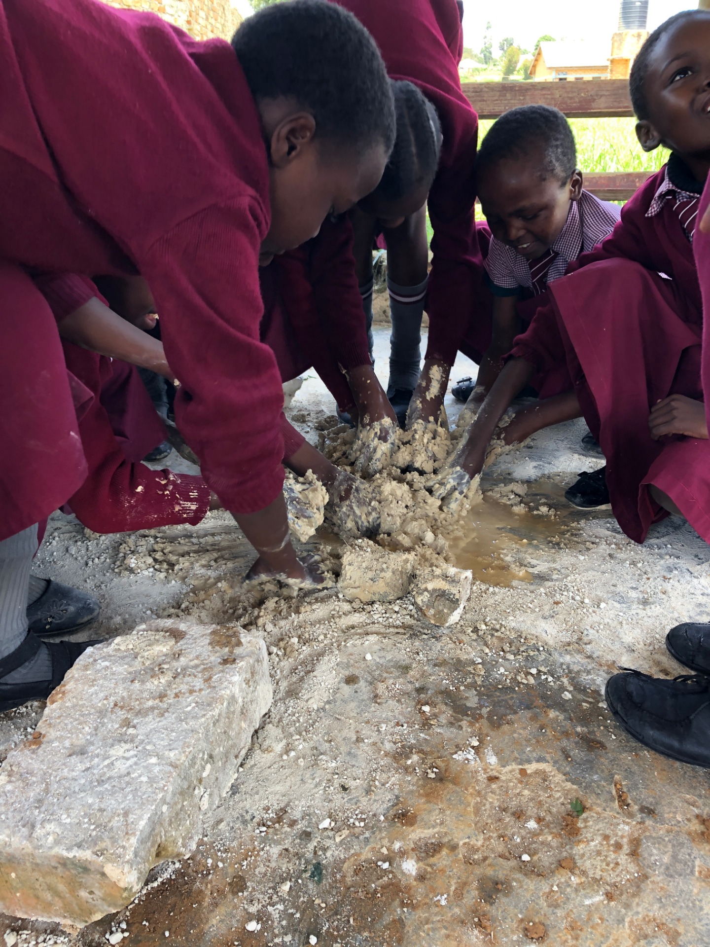 bezig met klei te maken. De blokken van teacher Ruth hadden ze fijngemalen en
